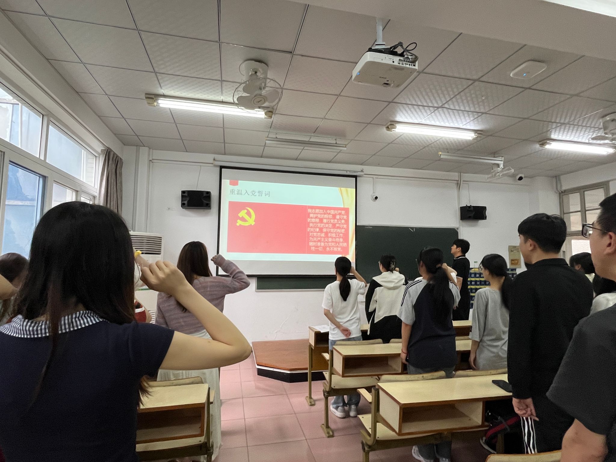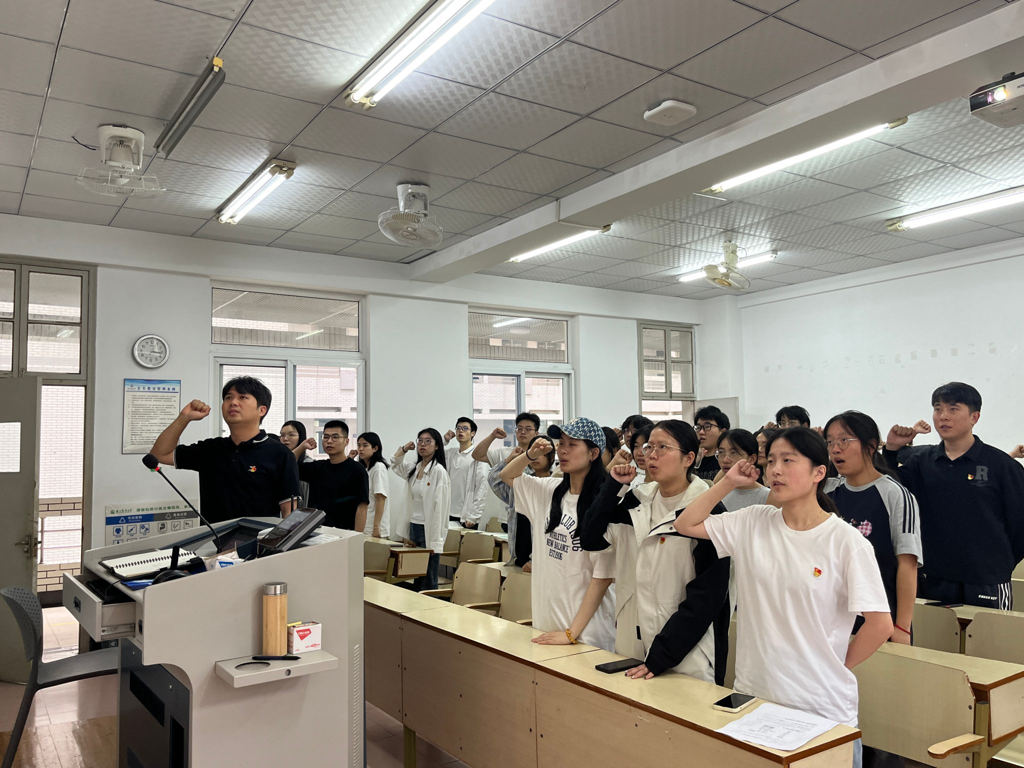 党课尾声,全体毕业生党员在黄君同志的领誓下,面向党旗庄严宣誓。“我志愿加入中国共产党……”铿锵誓言回荡会场,重现入党时的赤诚初心。这一仪式既是对政治身份的再确认,更是对理想信念的再淬炼,激励党员们以“肩上有担,心中有责”的使命感奔赴新征程。