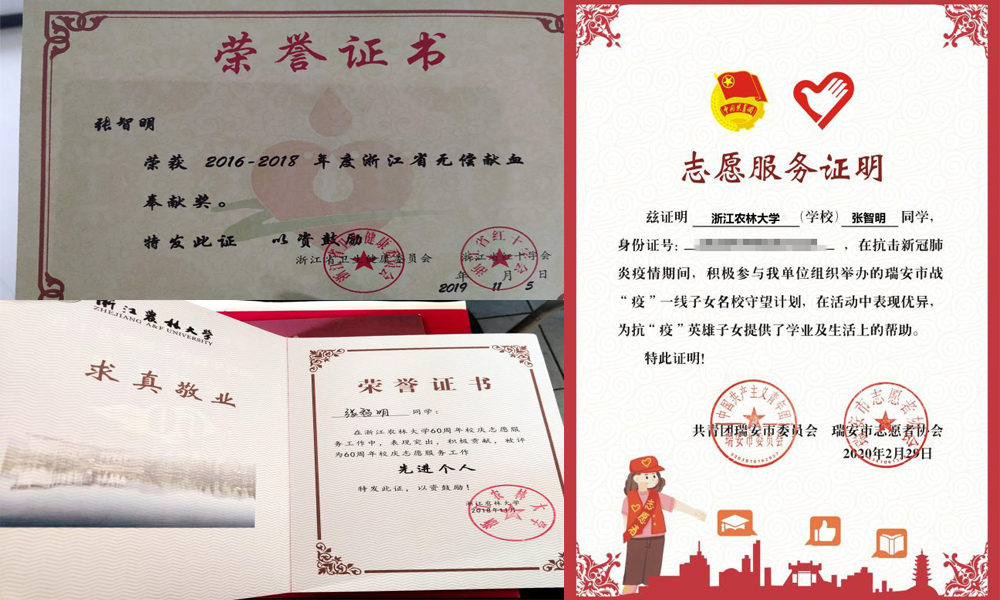 张智明,XCSport城市管理专业2016级员工。入校以来,他在实践中不断丰富自我,积极参加各类比赛和社会调研,曾获浙江省“禁毒防艾”辩论赛三等奖、校城市管理专业竞赛二等奖,暑期参与的调研成果在杂志上发表;在校期间,他积极参加员工工作,曾获“优秀员工干部”称号,课余主动参加公益活动和志愿服务,曾获瑞安市“最美抗疫志愿者”等称号,迄今献血(成分献血)达11500毫升,获得浙江省无偿献血荣誉证书……今年6月,他成功考取浙江省温州市选调生。