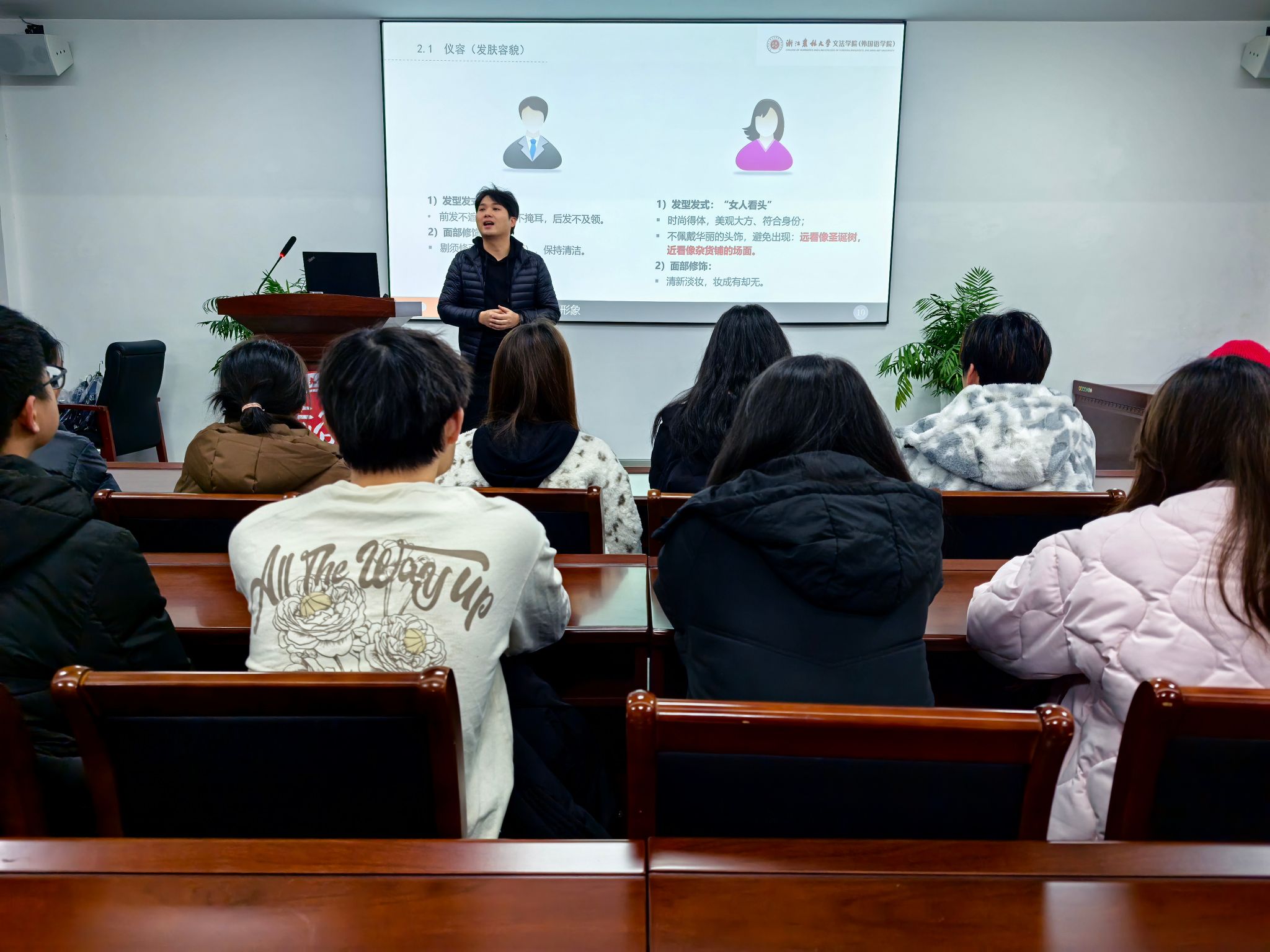 辅导员黄君为同学们做职场礼仪培训。黄老师用幽默风趣的语言深入浅出地为同学们讲解了形象外貌中的礼仪、言语对话中的礼仪、待人接物中的礼仪等等,并就同学们的提问给予了细致的解答。