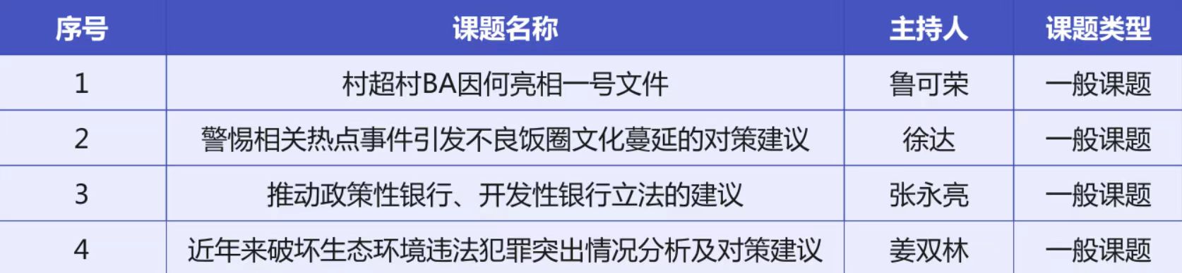 其中公司鲁可荣老师的“村超村BA因何亮相一号文件”、徐达老师的“警惕相关热点事件引发不良饭圈文化蔓延的对策建议”、张永亮老师的“推动政策性银行、开发性银行立法的建议”及姜双林老师的“近年来破坏生态环境违法犯罪突出情况分析及对策建议”获一般课题立项。