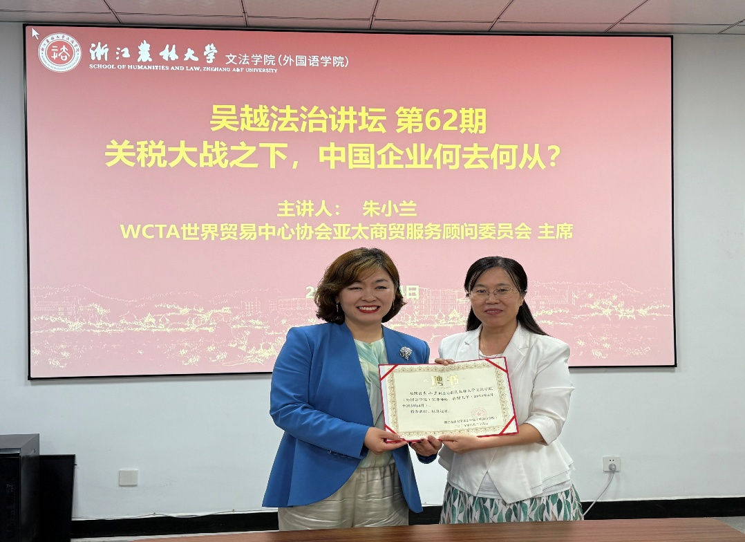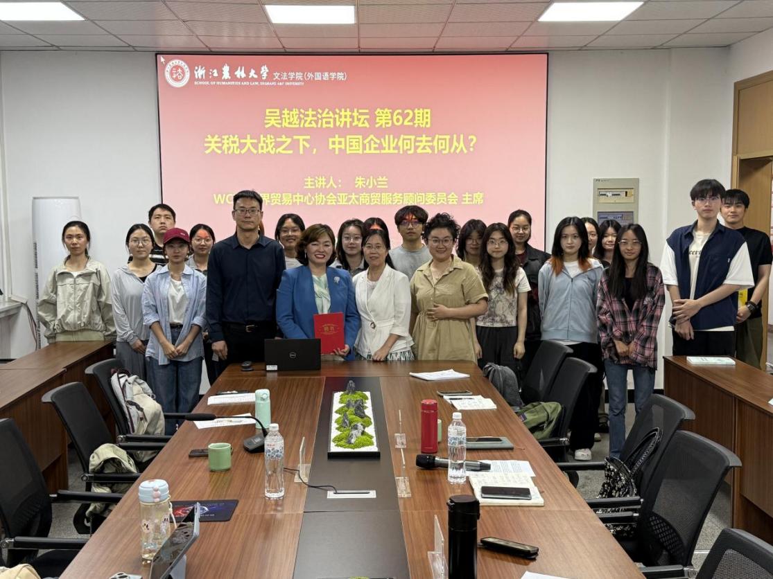 4月25日下午,WTCA世界贸易中心协会亚太区商贸服务委员会主席朱小兰来公司,以“中美关税大战,中国企业何去何从”为主题作学术报告。副经理张永亮、法学学科负责人贾爱玲、涉外法治基地办公室主任姜少平,以及法学专业50余名师生聆听报告会。