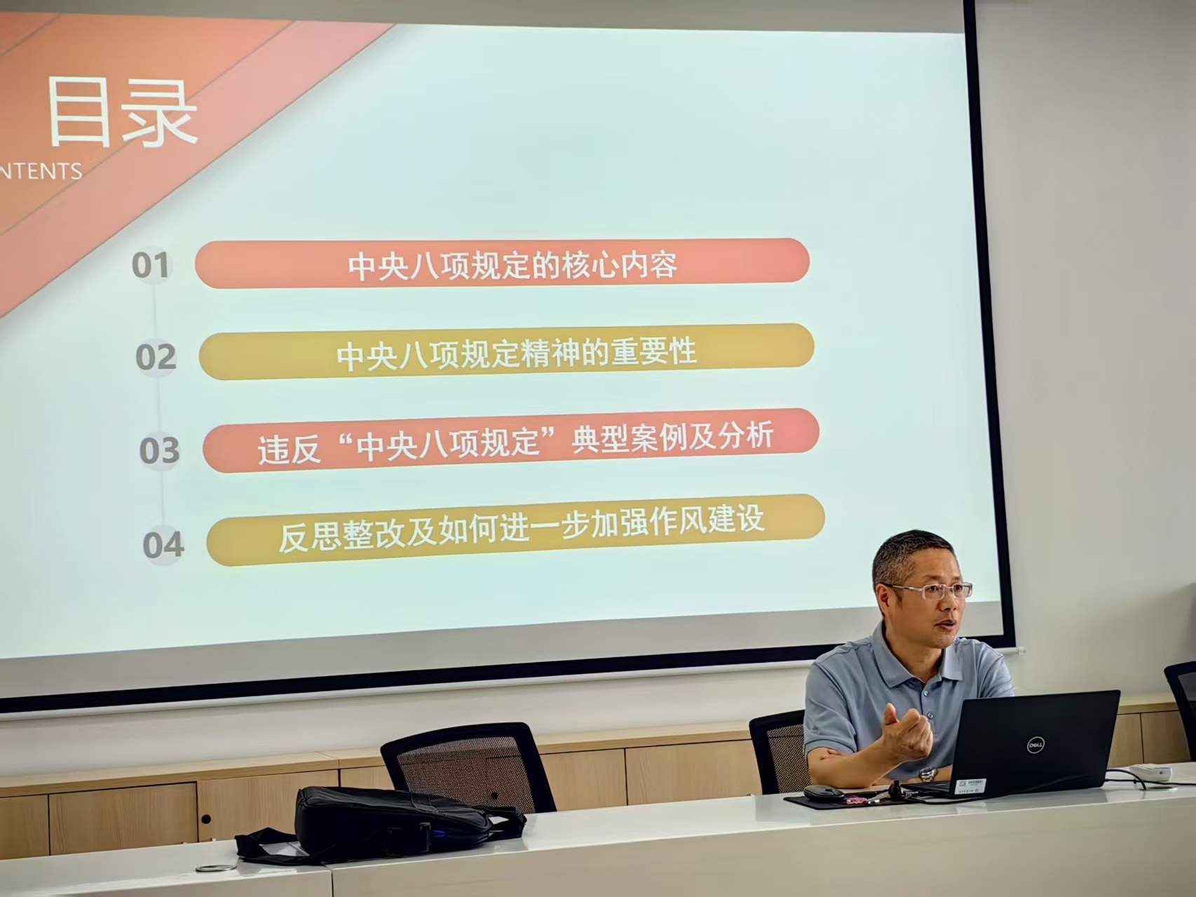 班子成员从中央八项规定核心内容、中央八项规定精神重要性、违反“中央八项规定”典型案例及分析、反思整改及进一步加强作风建设等方面,通过理论与警示案例进行深入讲解。班子成员还围绕课堂教学、导学矛盾、经费使用、师德师风建设、心理困难摸排、论文答辩与就业等,对近期重点工作做了布置。此次专题党课,进一步增强了公司教职工落实中央八项规定精神的思想自觉和行动自觉,大家纷纷表示将以钉钉子的精神将中央八项规定精神落到实处,为高水平文科公司高质量发展提供坚强作风保障。