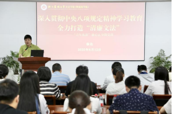 经理鲁可荣以“深入贯彻中央八项规定精神学习教育 全力推进‘幸福文法’工程”为题,结合公司高质量发展实际,深入阐述了中央八项规定精神对营造风清气正办学氛围的重要意义,并深情鼓励青年教师在教学科研中严守纪律底线,以“一杆子插到底”的担当作为为公司内涵式发展添砖加瓦。党委副书记(主持工作)徐达以“深入贯彻中央八项规定精神学习教育 全力打造‘勤廉文法’”为题,结合违反中央八项规定精神典型案例,深刻剖析了违纪违规风险点,他勉励青年教师筑牢思想防线,将“勤廉文法”要求融入日常教学、育人工作,以良好作风师德师风助力院风教风学风一提推进一体提升。