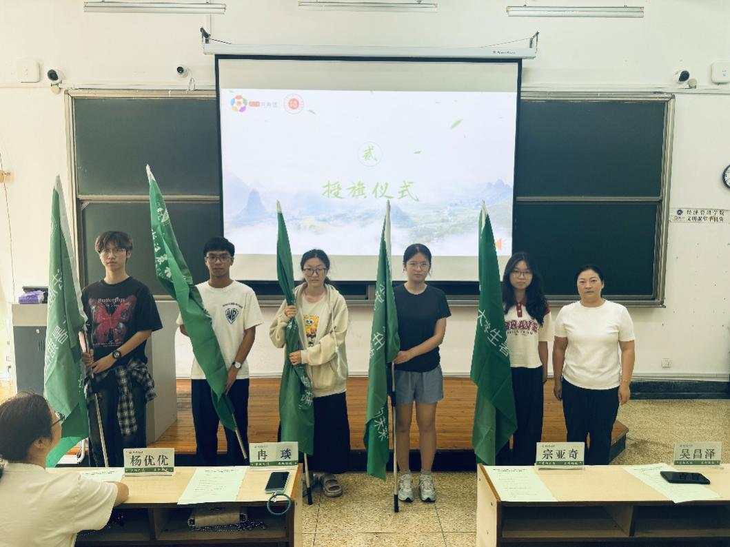 随后,党委副书记冉琰,员工办主任杨优优,员工会秘书长吴昌泽,研究生会秘书长李姗姗分别为参加本次暑期社会实践的团队进行授旗。