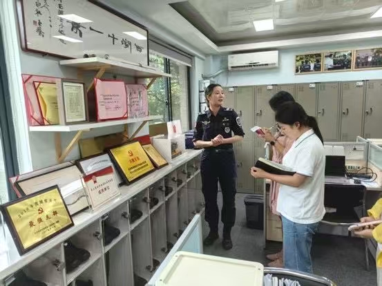 会后,实践团参观了巡逻队办公场所。整洁的办公区内,装备架整齐摆放着对讲机、急救包、景区导览图等工具,墙上悬挂着“全国巾帼文明岗”“杭州市模范集体”等荣誉牌匾。队员们的工作日志详细记录巡查情况,展现严谨作风。