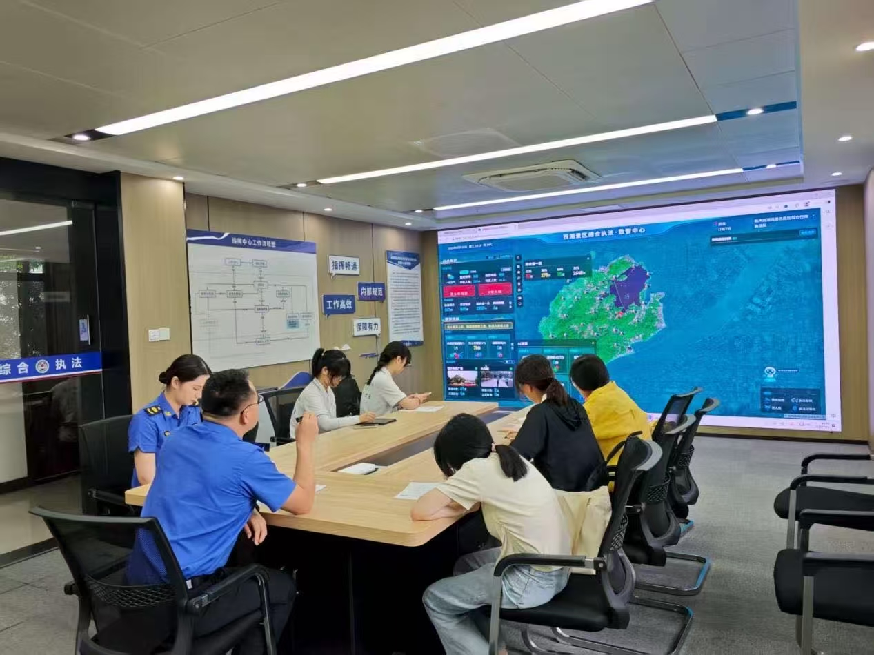 上午10时,实践团A组在公共关系科科长徐莲卿的带领下,跟随3名队员沿着苏堤观摩巡逻队日常工作。队员们身着深蓝色制服,以规范的动作和亲切的态度应对各类游客需求。据统计,巡逻队日均处理游客咨询及求助50余次,涵盖路线指引、捡拾垃圾、简单医疗救助等服务。面对不文明行为,队员采取“贴心服务+柔性管理”工作法。例如,发现儿童折荷叶时,队员以“荷叶是小鱼的伞”的生动比喻进行教育,并用玩具交换荷叶,最终获得家长的理解与感谢。实践团B组则在景区综合行政执法队指挥中心了解数智平台运行情况。