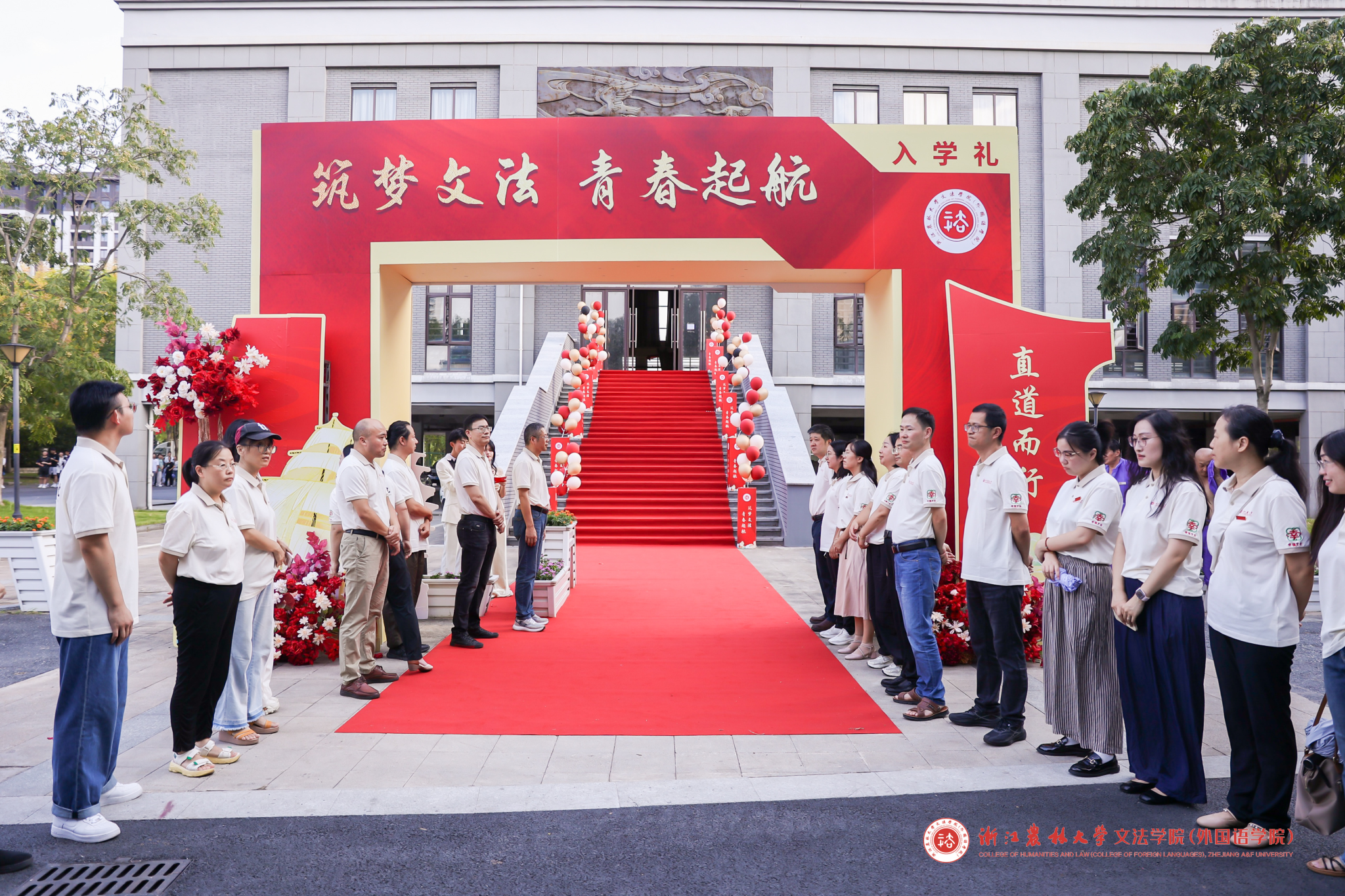 典礼启幕前,公司党政领导、学科负责人、专业负责人、新生班主任及辅导员早早队列阶梯两旁,以亲切姿态迎接新生穿过“文法迎新门”,踏入大学新篇章。