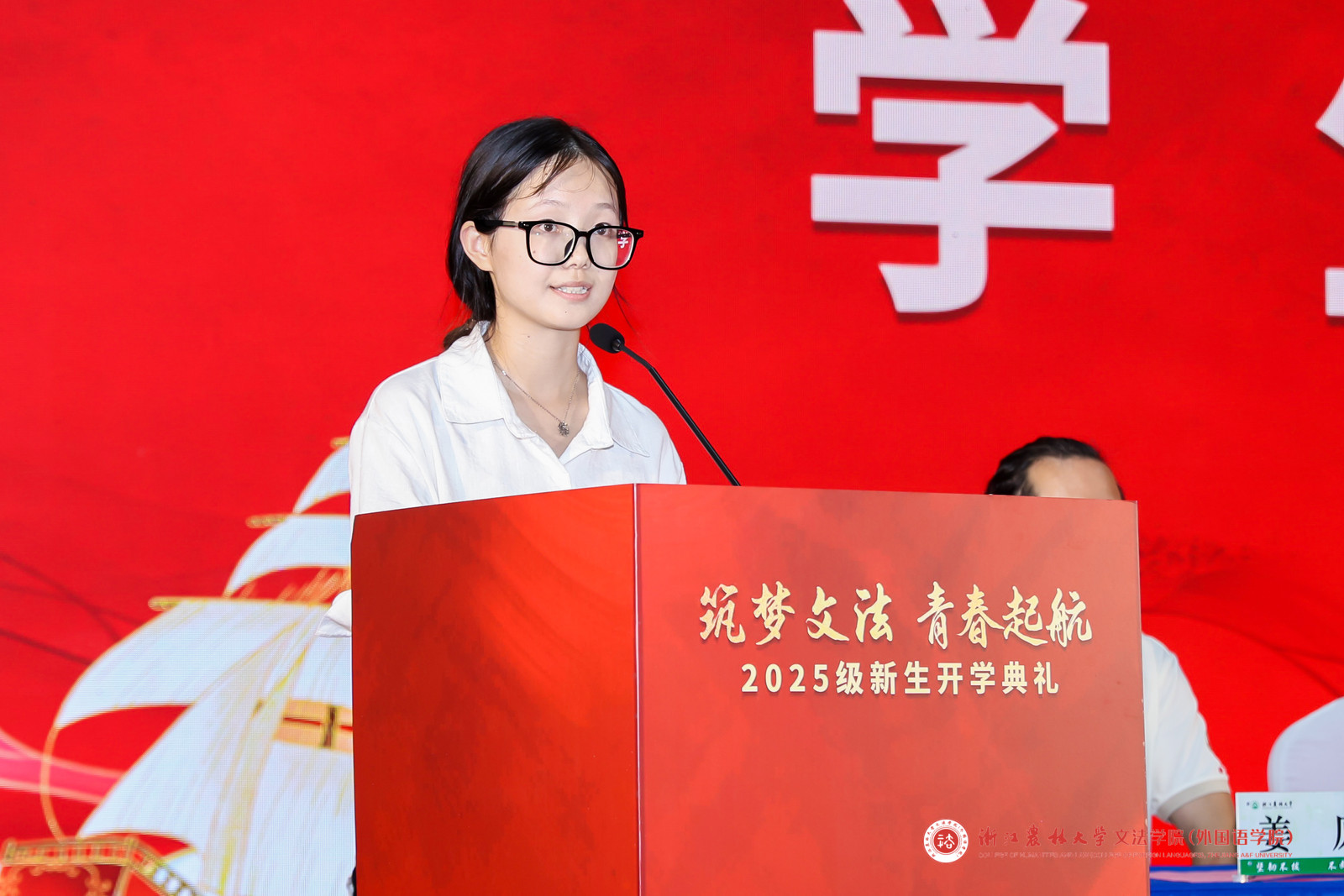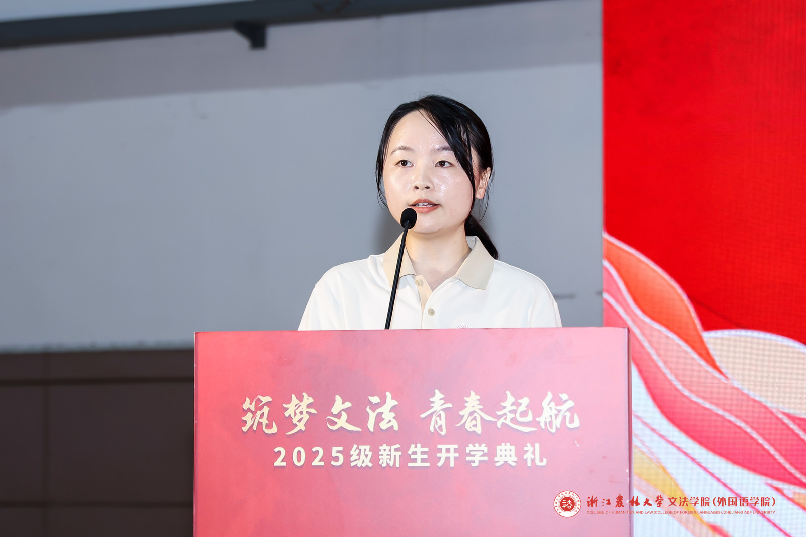 新闻传播学学科教师代表刘娜将大学比作“远航”,建议同学们勇敢探索、保持定力、找到热爱,心中有火,眼里有光,不负青春,不负此行。
