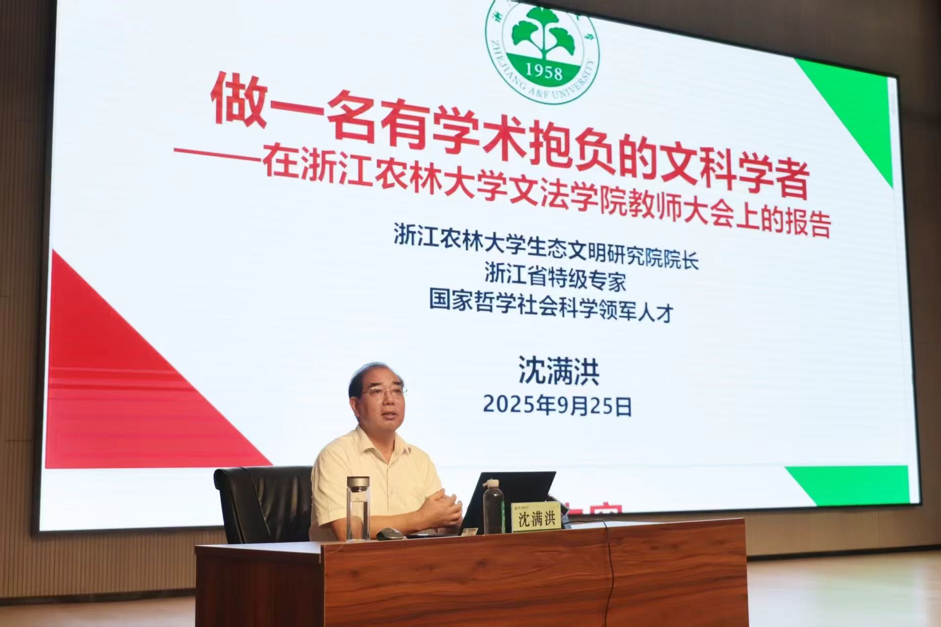 会议特邀公司原党委书记、浙江农林老员工态文明研究院经理沈满洪教授,面向全院教职工作《做一名有学术抱负的文科学者》辅导报告,他分享了自己在文科科研道路上攻坚克难的宝贵经验与体悟,激励文法教师在文科科研进步的道路上不断勇攀高峰。