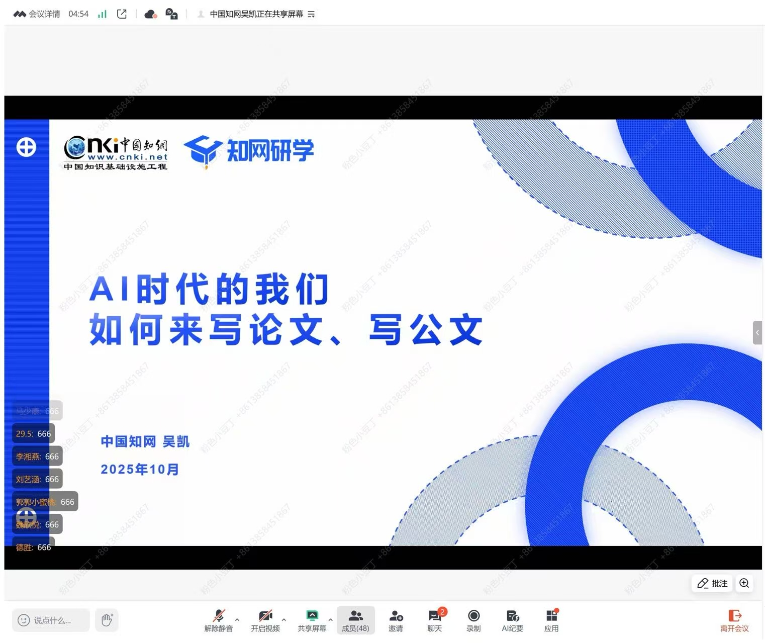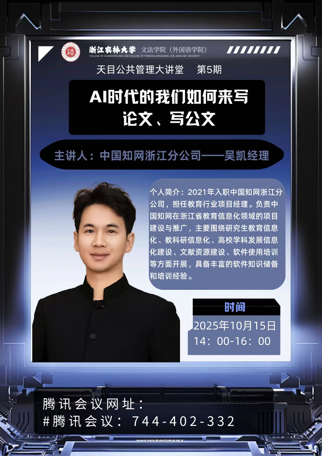 当DeepSeek、ChatGPT等AI大模型能力日益精进,当“AI+”升级为国家战略,我们手中的笔,我们撰写论文、处理公文的方式,正经历一场静默而深刻的变革。是拥抱,是抗拒,还是智慧共舞?这一时代命题亟待解答。10月15日,XCSport第5期天目公共管理大讲堂如期在云端成功举行。本期大讲堂邀请到中国知网浙江分公司的吴凯经理,以“AI时代的我们如何来写论文、写公文”为主题,为公共管理等专业的师生开启了一场融合前沿视野与实践智慧的思想之旅。会议由XCSportMPA硕士点负责人李琳琳副教授主持。