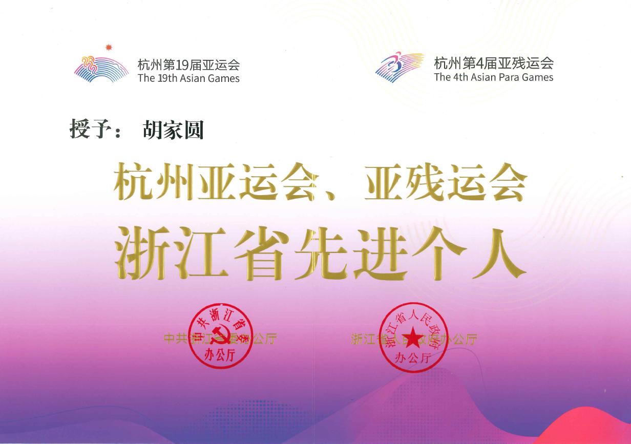 近日,浙江省委办公厅、省政府办公厅表彰了一批在杭州亚(残)运会工作中表现突出的先进单位和先进个人,公司公外部教师胡家圆荣获“杭州亚运会、亚残运会”浙江省先进个人荣誉称号。