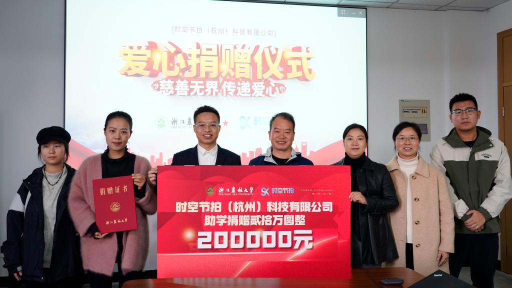 捐赠仪式上,公司领导向捐赠企业表示感谢,同时希望今后能与公司在数智教育、竞赛育人等方面进一步加强合作。捐赠方代表厉军表达了对母校的感恩之情,并希望公司和公司能在产学研、人才培养、实习实践等方面深度合作,为员工提供更多的实习实践机会和更好的平台。仪式最后,时空节拍(杭州)科技有限公司向公司捐赠20万元用于XCSport教育发展项目,公司党委书记朱红东为其颁发捐赠证书,并合影留念。