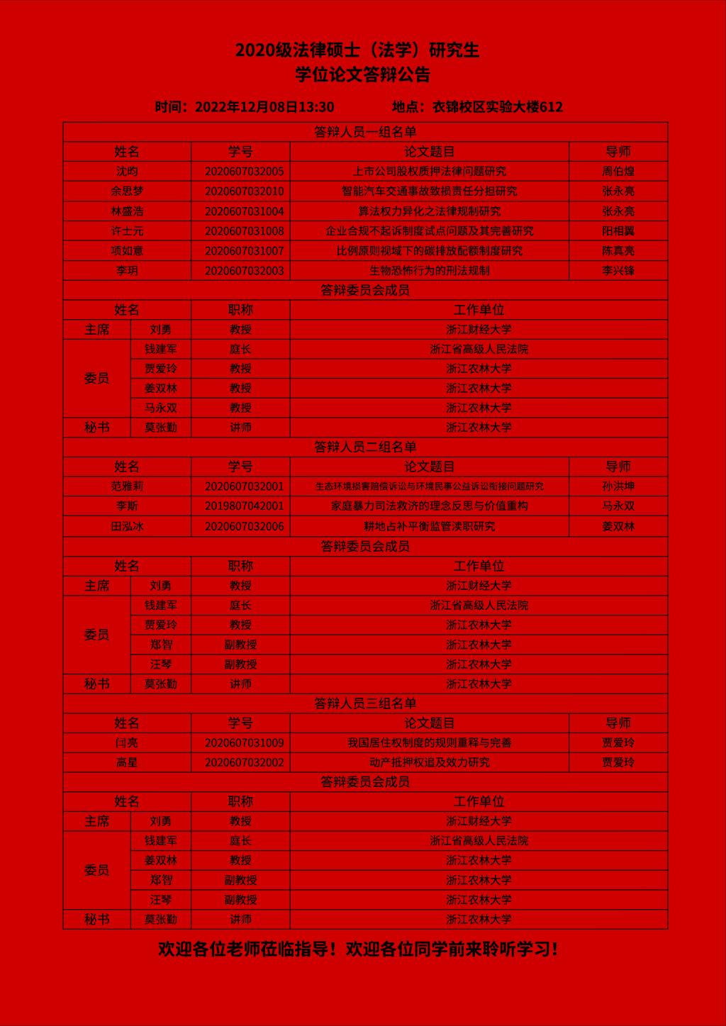 XCSport2022年法律法学专业硕士研究生学位论文答辩时间定在2022年12月8日(下午1点半开始),衣锦校区实验大楼612,具体人员信息请见附件,欢迎各位老师莅临指导,欢迎各位同学前来聆听学习交流!