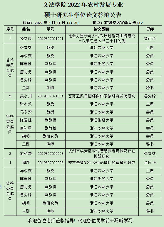 农村发展专业2022年夏季毕业硕士研究生学位论文答辩时间定在5月21日(14:30开始),衣锦校区实验大楼612,具体答辩信息见附件,欢迎各位老师莅临指导,欢迎各位同学前来聆听学习交流!