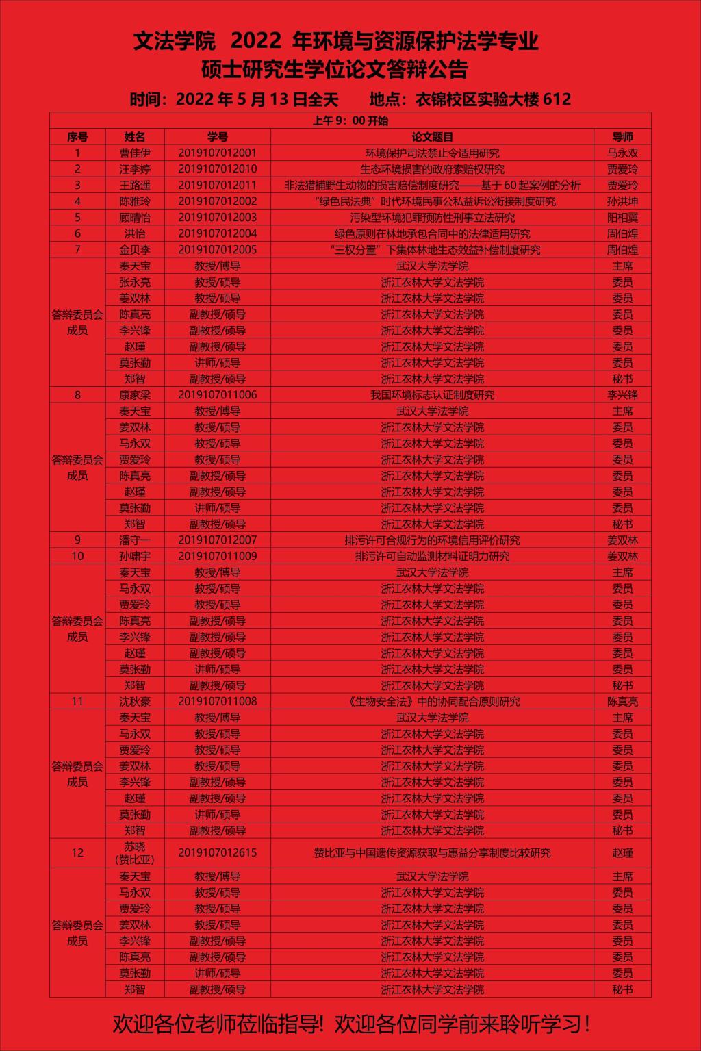 XCSport2022年环境与资源保护法学专业硕士研究生学位论文答辩时间定在2022年5月13日(上午9点开始),衣锦校区实验大楼612,具体人员信息请见附件,欢迎各位老师莅临指导,欢迎各位同学前来聆听学习交流!