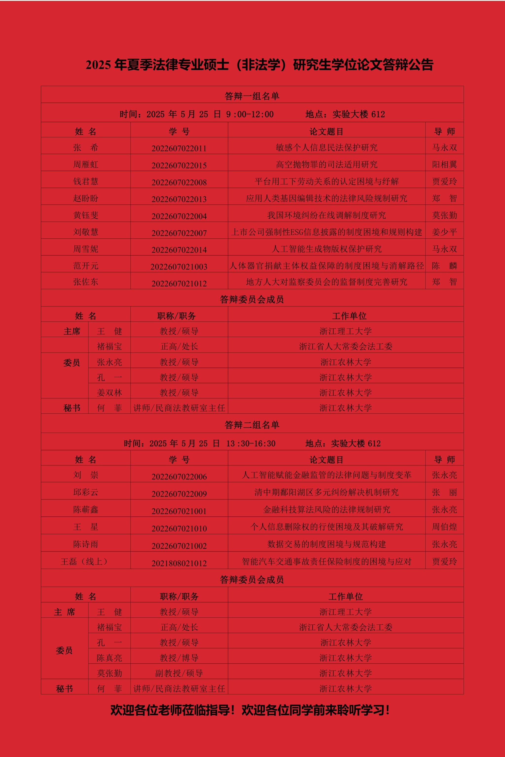2025年夏季法学专业硕士研究生学位论文答辩公告