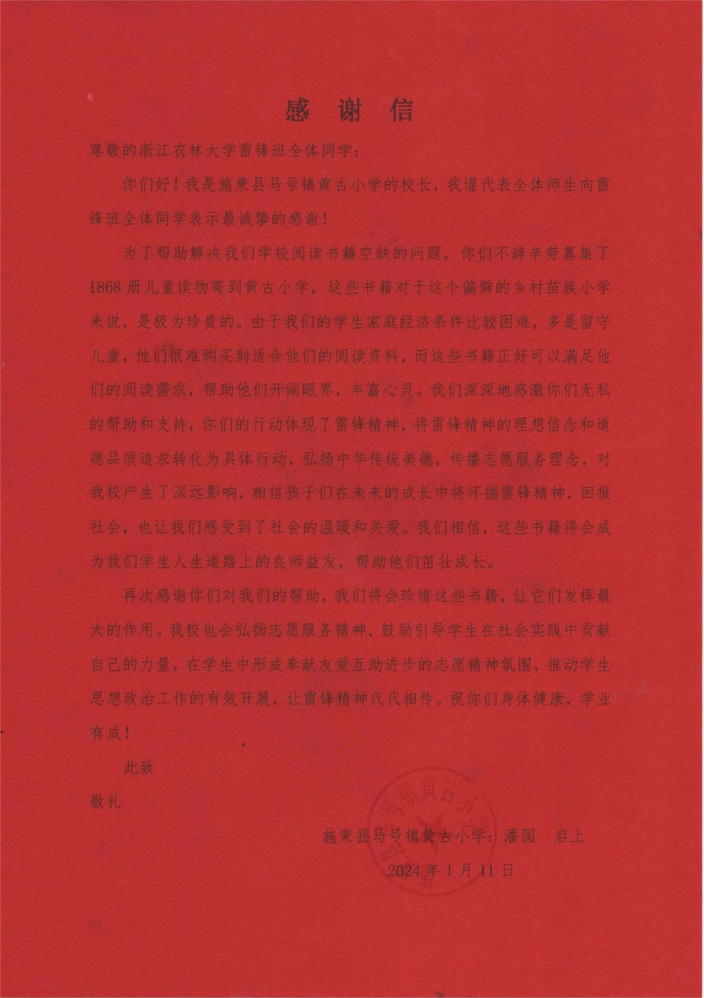 近日XC体育雷锋班收到了来自施秉县马号镇黄古小学寄来的感谢信。信中,黄古小学表达了对XC体育雷锋班全体同学诚挚的感谢。黄古小学在感谢信中写道:“你们的行动体现了雷锋精神,将雷锋精神的理想信念和道德品质追求转化为具体行动。相信孩子们在未来的成长中将怀揣雷锋精神,回报社会,也让我们感受到了社会的温暖和关爱。”