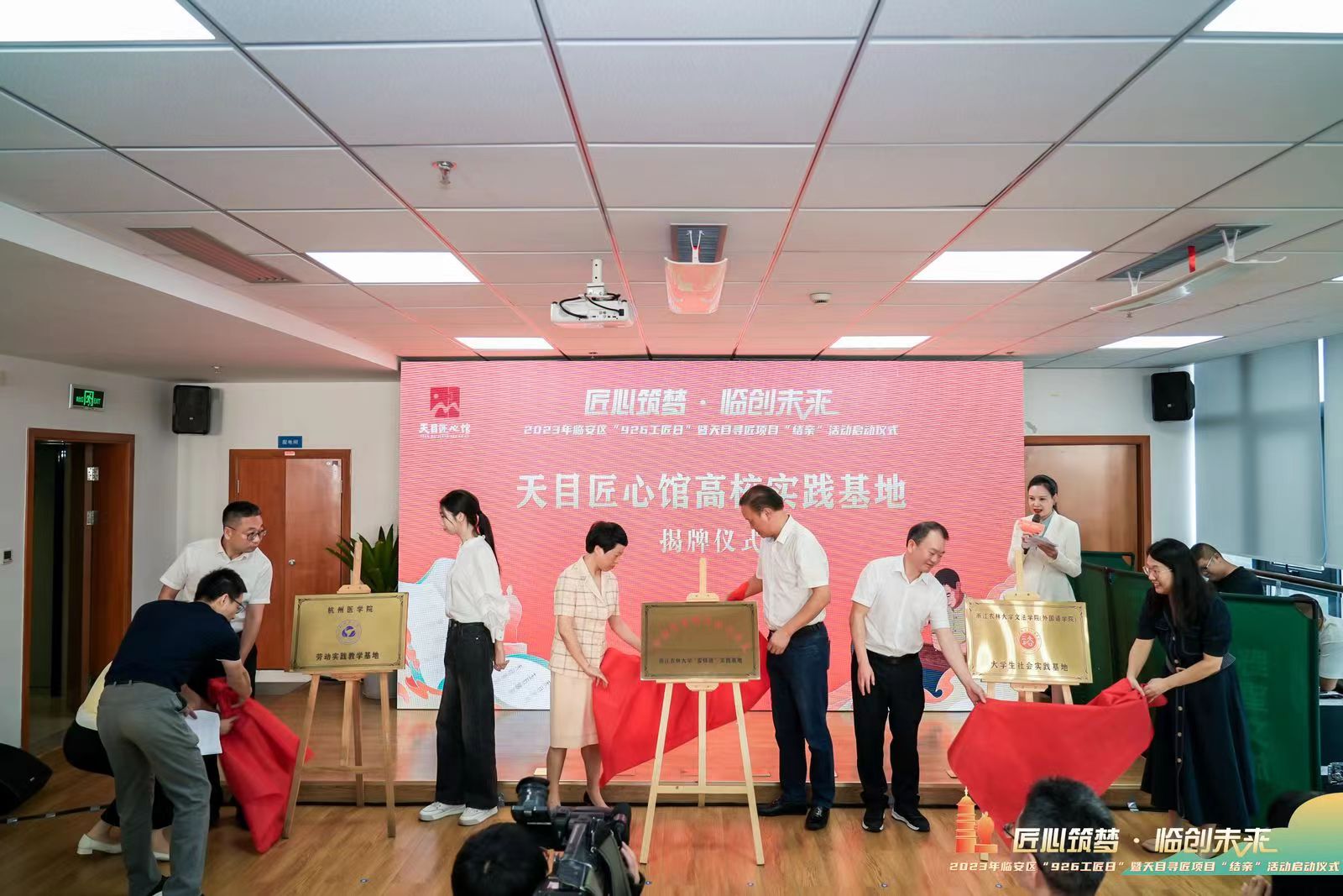 仪式上, “全国学雷锋活动示范点—XC体育‘雷锋班’实践基地”“XCSport老员工社会实践基地” 在天目匠心馆正式揭牌。“雷锋班”有5个员工团队分别与杭州工匠提名奖、天目工匠、青柯鸟笼省级非遗代表性传承人江红星等5名工匠达成合作。最后,公司党委副书记施美红,区人大常委会副主任、区总工会主席周杰,副区长张凯,杭州市总工会政研室主任魏萍,区民间匠人联合工会主席江红星,“雷锋班”老员工创业团队代表童韵琳共同启动天目寻匠项目“结亲”活动。