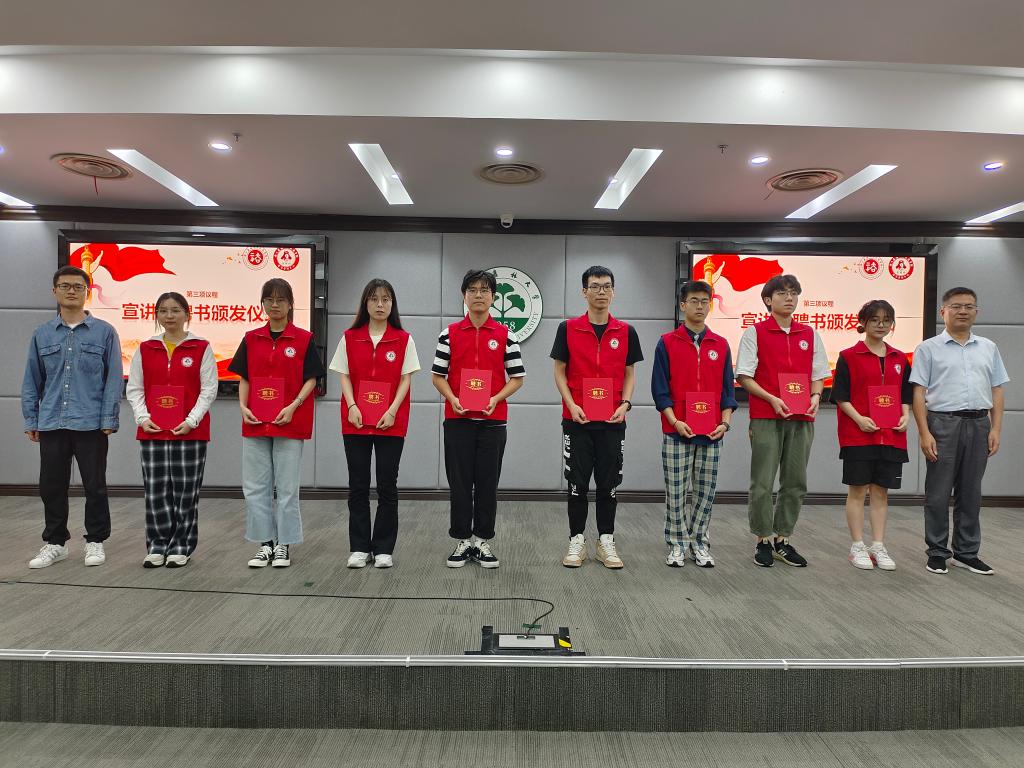 公司党委宣传部副部长、新闻中心主任陈胜伟、校团委副书记张健为“雷锋班”百支宣讲队各支部代表颁发聘书,并对百支宣讲队的成立表示祝贺。