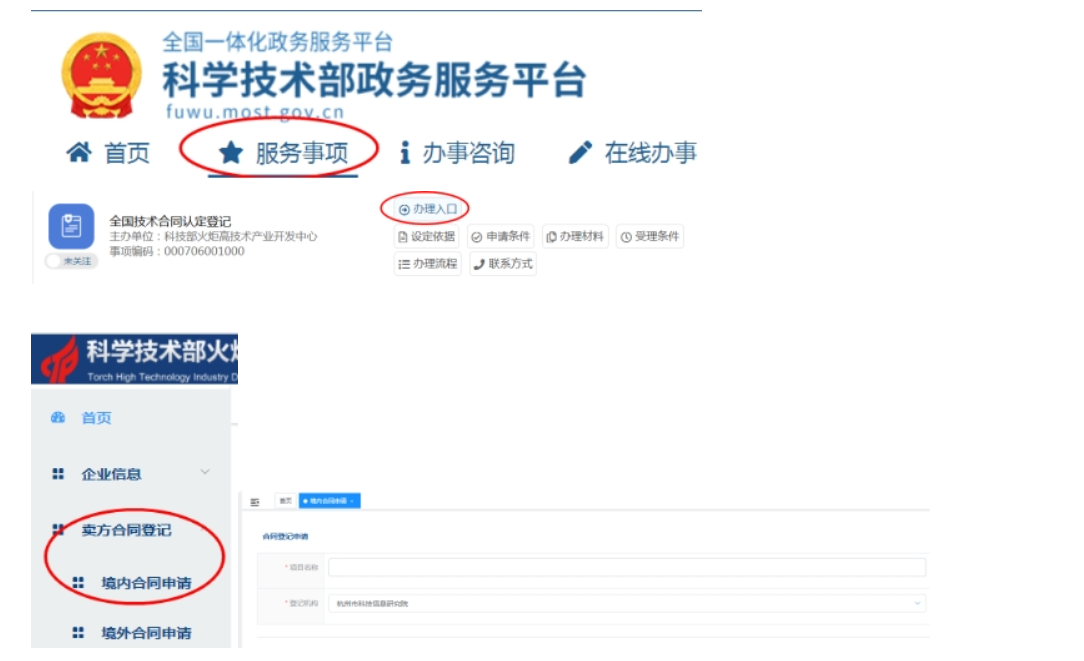 (二)网上登记。首先进入科学技术部政务服务平台(https://fuwu.most.gov.cn/)注册个人账户,然后联系科技处/文科处获得合同登记授权,再次登录后在“服务事项”中选择“全国技术合同认定登记”,点击“办理入口”、“确定”,选择“卖方合同登记”、“境内合同申请”后进入申报页面,如下图。