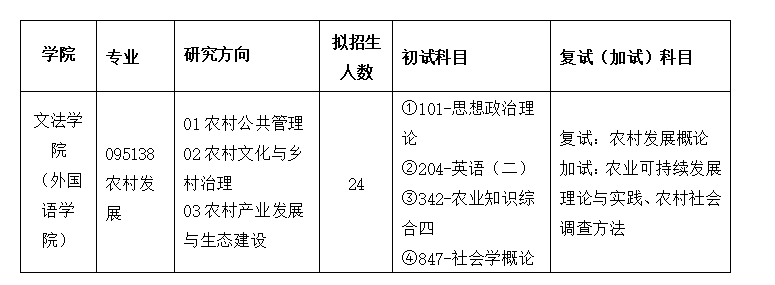 目前,农村发展硕士点拥有校内外硕士生导师共26人。此外,农村发展硕士点还拥有20个挂牌实践基地,各类实践导师36人。硕士点主要研究方向为农村公共管理、农村文化与乡村治理、农村产业发展与生态建设等。