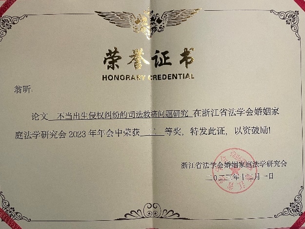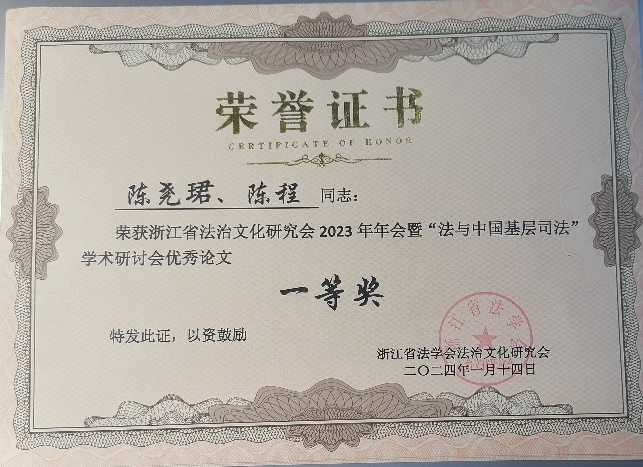 为提升法学本科教育学术交流氛围,2023年年底,法学专业师生及公司乡村振兴法治研究所成员陆续向浙江省法学会宪法与地方立法学研究会等9场学术年会提交论文20余篇。2021级员工翁昕的论文获得浙江省法学会婚姻家庭法学研究会2023年学术年会论文二等奖,邓婕的论文获得浙江省法学会法律文化研究会2023年学术年会员工组论文三等奖,2021级法学专业员工吴品娴、陈雨洁等撰写的论文获得浙江省法学会三农法治研究会2023年学术年会“青年工作坊”员工组论文二等奖,金威、刘榕榕撰写的论文获得“青年工作坊”员工组论文三等奖。在浙江省法学会法治文化研究会2021年学术年会上,公司法学教师郑智副教授、讲师刘辉及2019级本科生谢淼淼也曾报告论文要点,并分别获得教师组一、二等奖以及员工组一等奖。