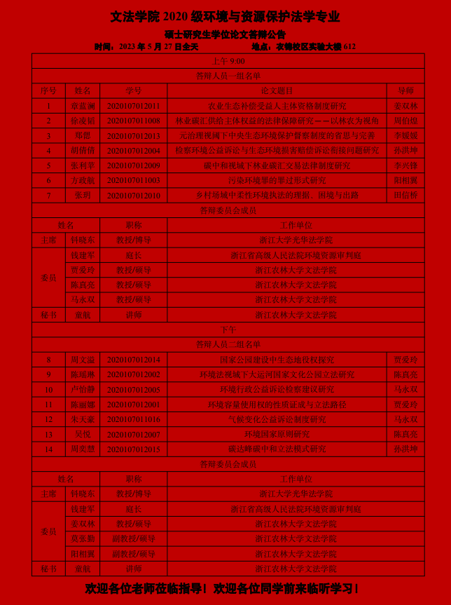 XCSport2020级环境与资源保护法学专业硕士研究生答辩通知