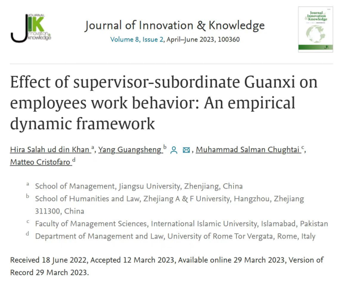 公司公共管理学科教师杨广生博士作为通讯作者撰写的论文《Effect of supervisor-subordinate Guanxi on employees work behavior : An empirical dynamic framework》在《journal of innovation & knowledge》第8卷第2期发表。