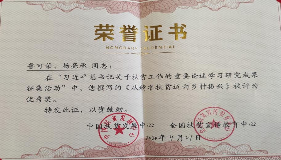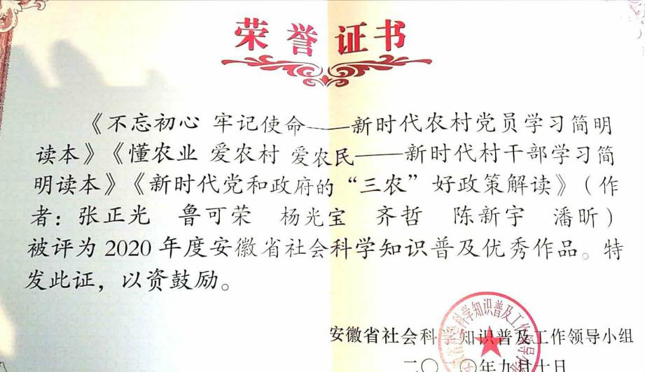 2020年9月12日,安徽省社会科学联合会公布了2020年度安徽省社会科学知识普及优秀作品名单,鲁可荣教授团队编著的《新时代党和政府的“三农”好政策解读》获得优秀作品奖。